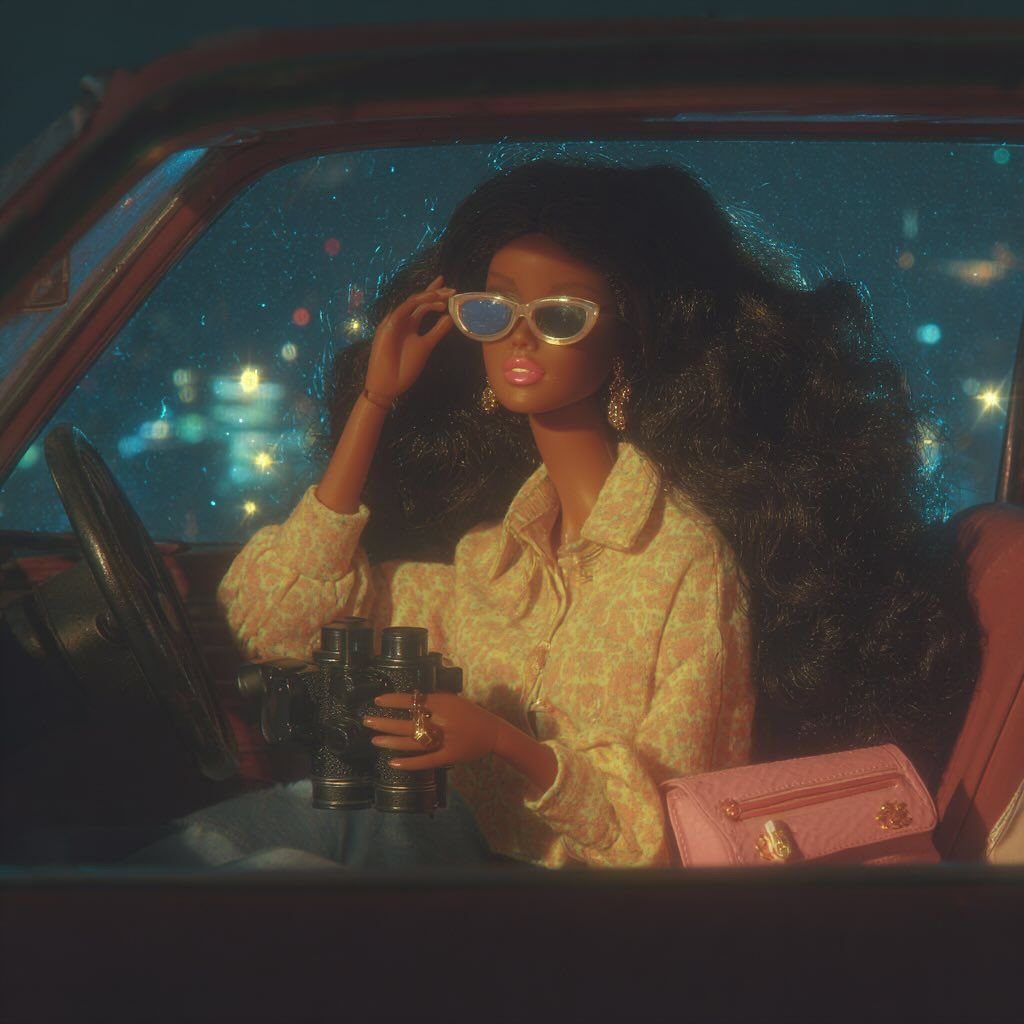 Image of a Barbie in a car holding binoculars in sunglasses.